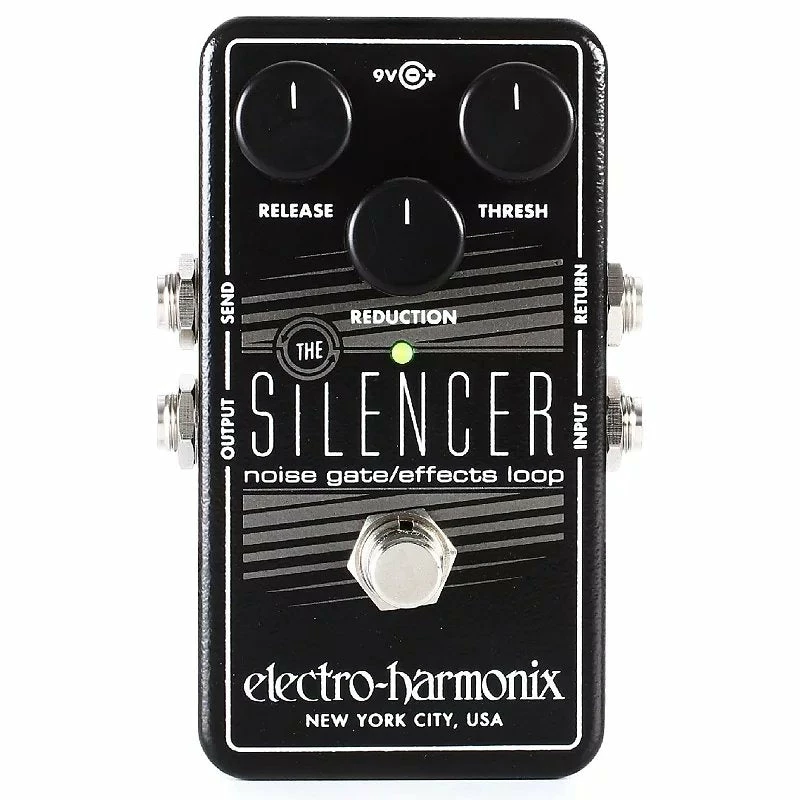 I/O includes ยผ inch Input, Output, Send and Return jacks. The footswitch selects whether The Silencer is engaged or in bypass mode; buffered bypass allows the effects loop to remain in your signal path when the gate is bypassed. A built-in AC jack accepts a standard power supply like the EHX 9.6DC unit (optional) and the pedal comes with a 9V battery.